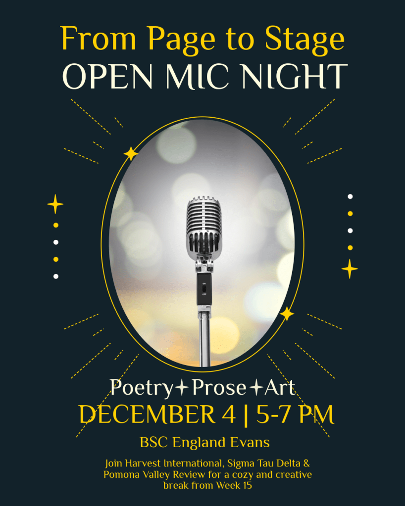 Harvest International invites you to join us, along with Sigma Tau Delta and Pomona Valley Review, on Thursday, December 4, from 5–7 p.m. for a night of creative expression and a break from week 15! Come for the art and stay for the food. Feel free to simply enjoy the performances and ambiance, if you don’t feel like sharing your work, yet…